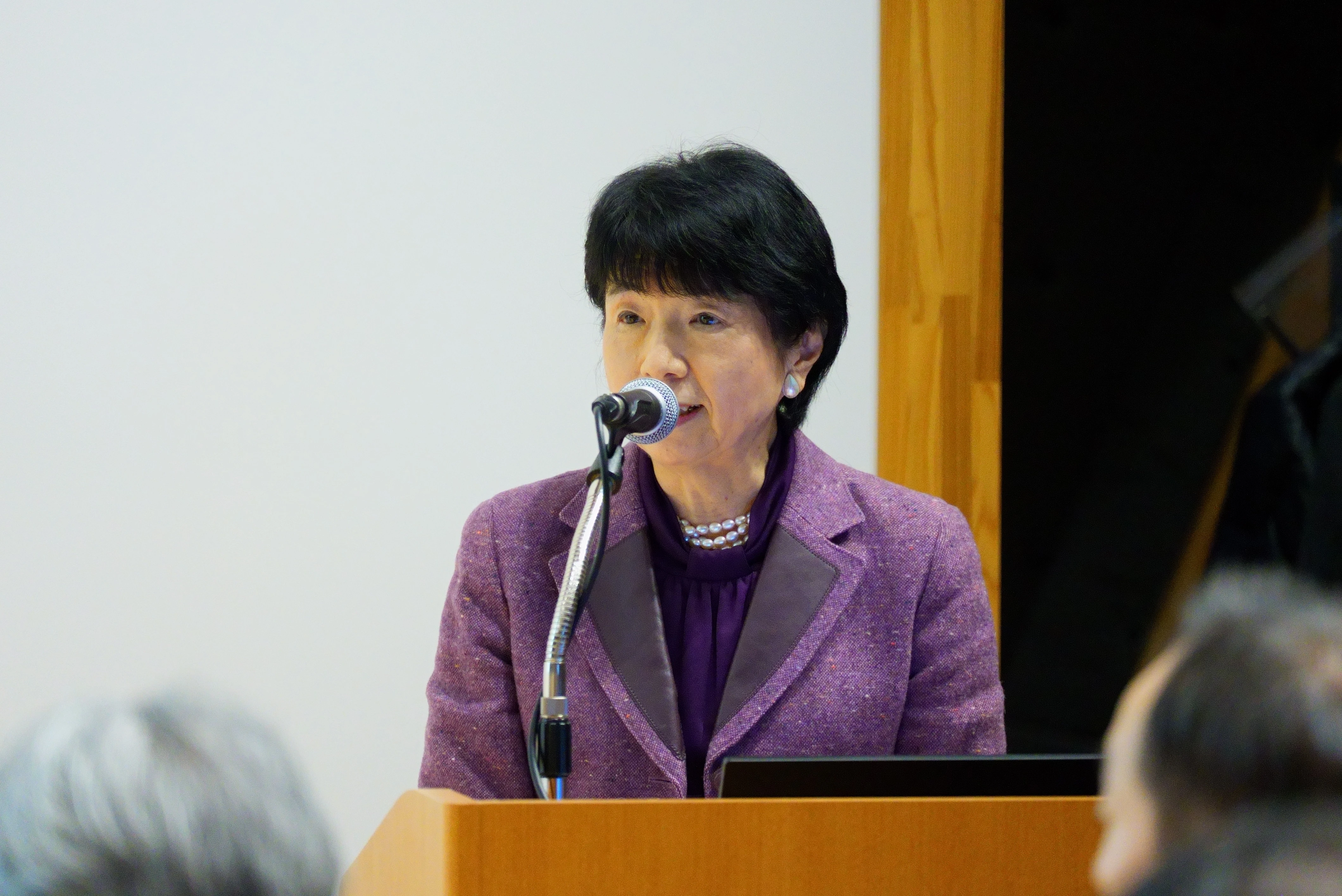 石川台7号館の三島ホールで開かれたシンポジウムには、関係者を含めて約80人が参加し、最初に本学の田中雄二郎学長とGRIPSの大田弘子学長が開会挨拶を行いました。