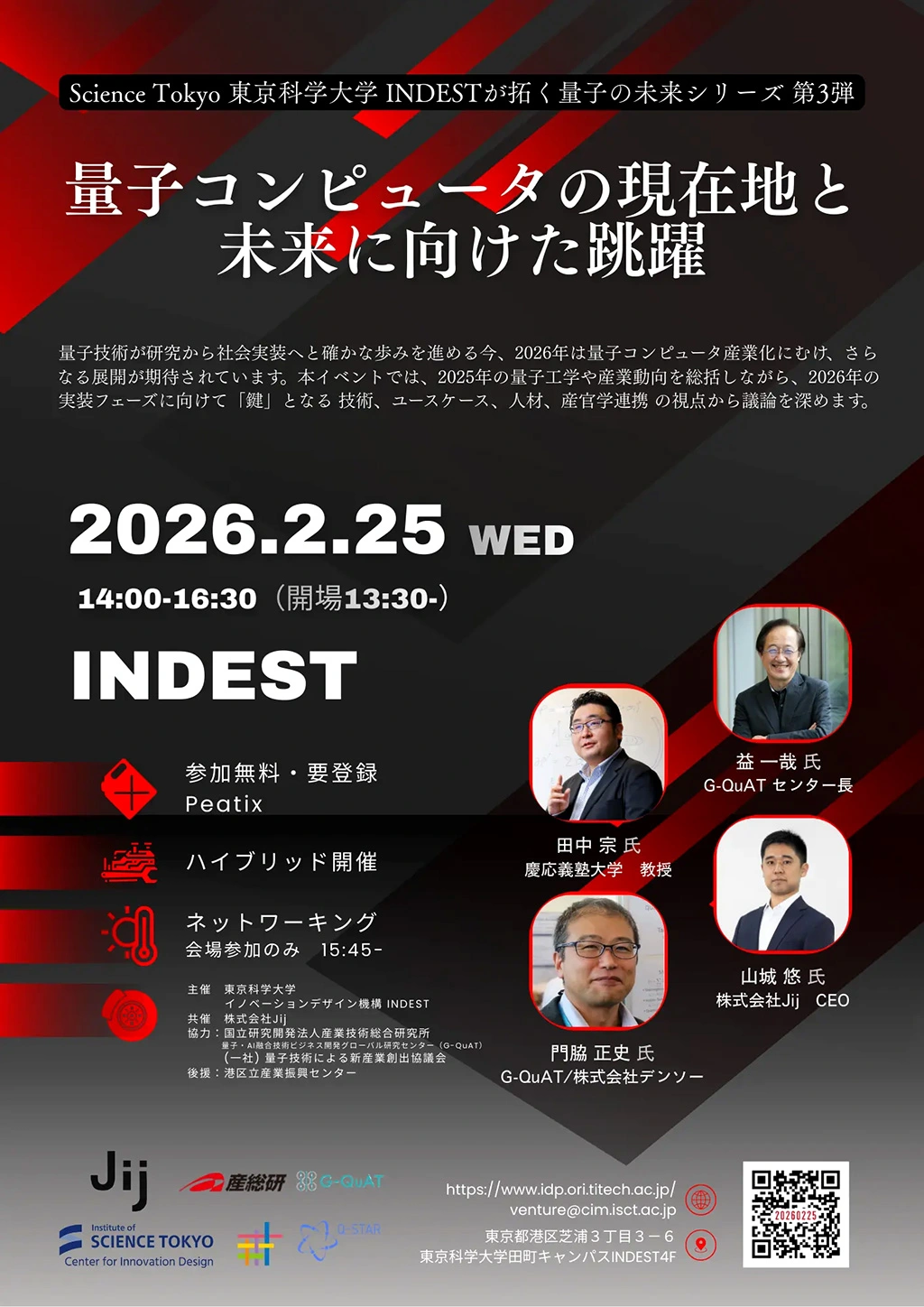 今回は、国立研究開発法人産業技術総合研究所、量子・AI融合技術ビジネス開発グローバル研究センター(G-QuAT)のセンター長であり、東京科学大学特別顧問・名誉教授の益一哉氏、株式会社デンソーの門脇正史氏、慶應義塾大学教授の田中宗氏をゲストとしてお迎えし、トークセッションを行います。ナビゲーターは株式会社Jij のCEO、山城悠氏が務めます。