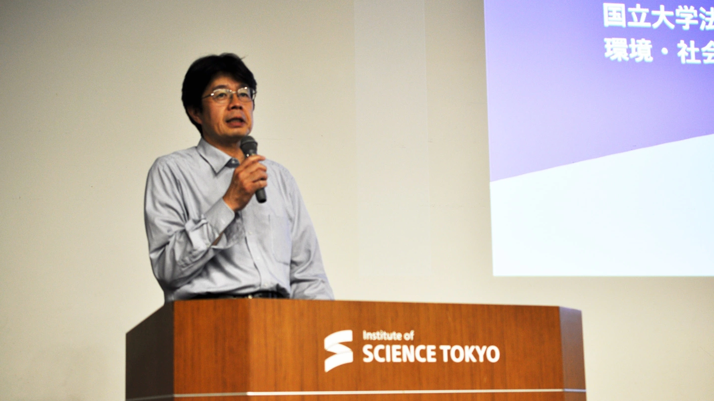 シンポジウムでは、プログラム総括の岩波光保環境・社会理工学院長の開会のあいさつとプログラムの概要説明に続き、大竹尚登理事長が「東京科学大学の設立とこれから」と題した講演を行いました。講演の中で大竹理事長は、善き生活、善き社会、善き地球をつくりあげる大学というScience Tokyoのビジョンと、その実現のための研究教育組織「Visionary Initiative(VI:ビジョナリーイニシアティブ)[用語1]」について紹介するとともに、Science Tokyoが目指すべき方向は本プログラムと親和性があると述べました。