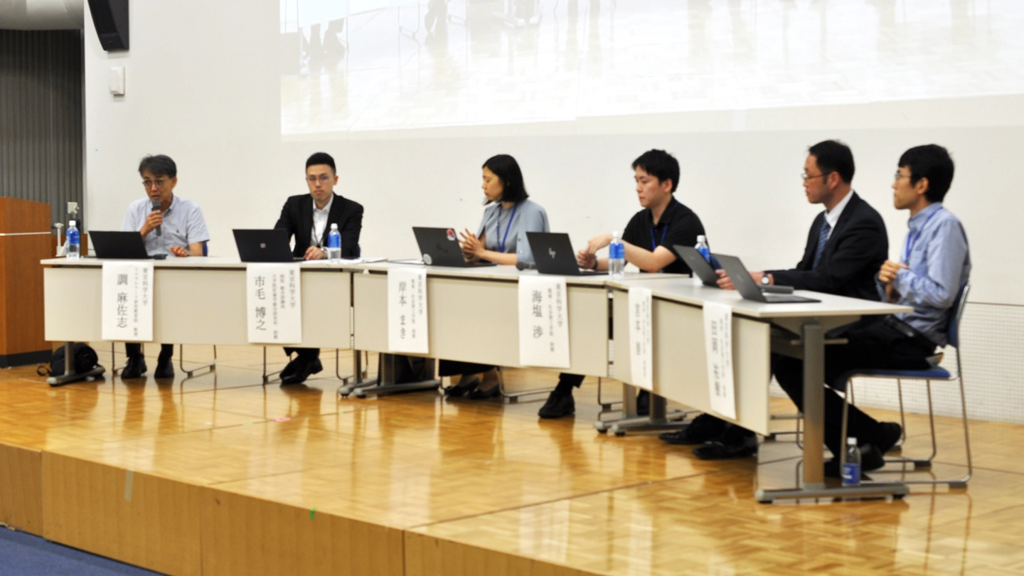 次世代研究者によるパネルディスカッションでは、リベラルアーツ研究教育院の調麻佐志教授がモデレーターを務め、医学、工学にわたる多様な専門領域の若手教員5人が「未来社会のデザイン:都市・インフラの50年先を語る」をテーマに議論しました。