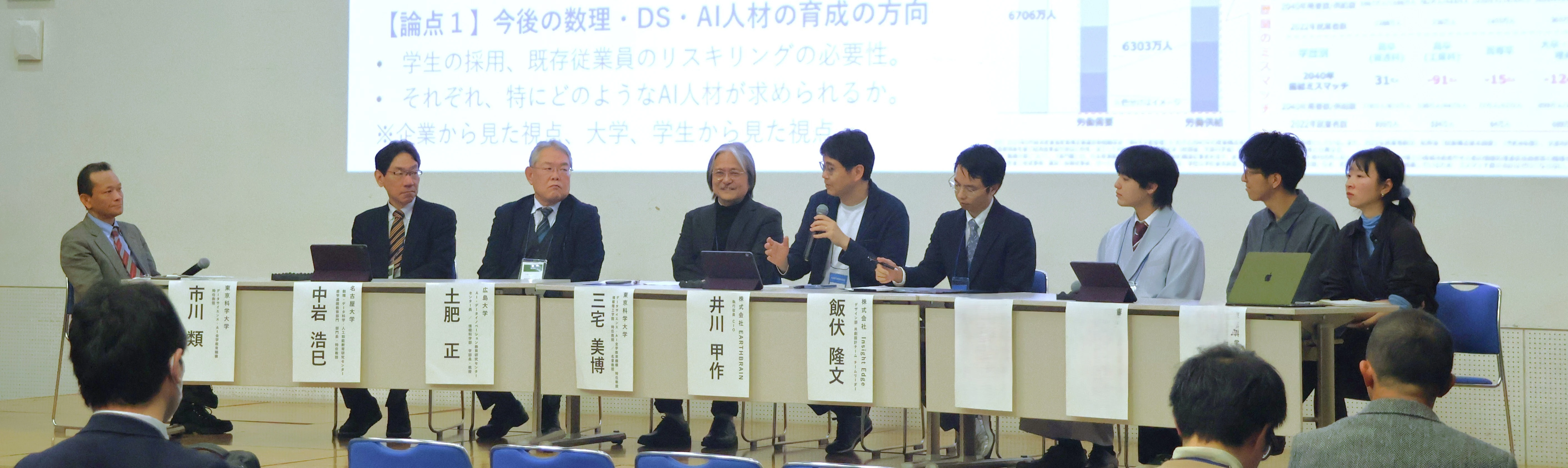 講演終了後、3名の講演者に加え、産業界から2名、本学学生3名、モデレーターである東京科学大学の市川類特任教授の計9名によるパネルディスカッションが行われました。「DS・AI人材育成」については、企業から「AIコーディングツールの登場でエントリーレベルのエンジニア就職は困難になりつつありる。概念理解や抽象化の能力がより重要になる」との指摘がありました。学生からは「DS・AI専門外でもデータを活用できる人材が必要であり、全学的なDS・AI教育に意義がある」との意見や、「ユースケースを創出できる人材、すなわち技術を使う場面を自ら作れる人材が重要だ」との意見が挙がりました。