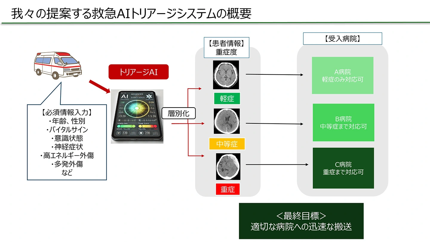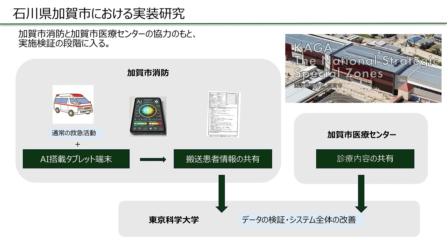 東京科学大学(Science Tokyo)大学院医歯学総合研究科 脳神経機能外科学分野(東京科学大学病院 脳神経外科)阿部大数助教・稲次基希准教授、東京科学大学 医療・創薬イノベーション教育開発機構長谷武志特任教授のチームは、これまでの研究成果をもとに「救急医療における搬送前AIトリアージシステム」を開発しました。これは、本学が2023年度と2024年度に採択された経済産業省AKATSUKIプロジェクト「医療DXイノベーション人材育成プログラム」においてアプリ制作に取り組んだもので、その社会実装に向けて、内閣府が国家戦略特区に指定する加賀市、加賀市医療センター、加賀市消防本部と協働し、12月15日から実証実験を開始します。